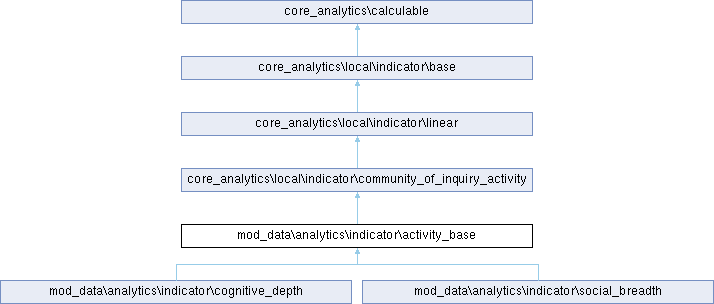 Reimplemented in mod_assign\analytics\indicator\cognitive_depth, mod_assign\analytics\indicator\social_breadth, mod_book\analytics\indicator\cognitive_depth, mod_book\analytics\indicator\social_breadth, mod_chat\analytics\indicator\cognitive_depth, mod_chat\analytics\indicator\social_breadth, mod_choice\analytics\indicator\cognitive_depth, mod_choice\analytics\indicator\social_breadth, mod_data\analytics\indicator\cognitive_depth, mod_data\analytics\indicator\social_breadth, mod_feedback\analytics\indicator\cognitive_depth, mod_feedback\analytics\indicator\social_breadth, mod_folder\analytics\indicator\cognitive_depth, mod_folder\analytics\indicator\social_breadth, mod_forum\analytics\indicator\cognitive_depth, mod_forum\analytics\indicator\social_breadth, mod_glossary\analytics\indicator\cognitive_depth, mod_glossary\analytics\indicator\social_breadth, mod_imscp\analytics\indicator\cognitive_depth, mod_imscp\analytics\indicator\social_breadth, mod_label\analytics\indicator\cognitive_depth, mod_label\analytics\indicator\social_breadth, mod_lesson\analytics\indicator\cognitive_depth, mod_lesson\analytics\indicator\social_breadth, mod_lti\analytics\indicator\cognitive_depth, mod_lti\analytics\indicator\social_breadth, mod_page\analytics\indicator\cognitive_depth, mod_page\analytics\indicator\social_breadth, mod_quiz\analytics\indicator\cognitive_depth, mod_quiz\analytics\indicator\social_breadth, mod_resource\analytics\indicator\cognitive_depth, mod_resource\analytics\indicator\social_breadth, mod_scorm\analytics\indicator\cognitive_depth, mod_scorm\analytics\indicator\social_breadth, mod_survey\analytics\indicator\cognitive_depth, mod_survey\analytics\indicator\social_breadth, mod_url\analytics\indicator\cognitive_depth, mod_url\analytics\indicator\social_breadth, mod_wiki\analytics\indicator\cognitive_depth, mod_wiki\analytics\indicator\social_breadth, mod_workshop\analytics\indicator\cognitive_depth, and mod_workshop\analytics\indicator\social_breadth.