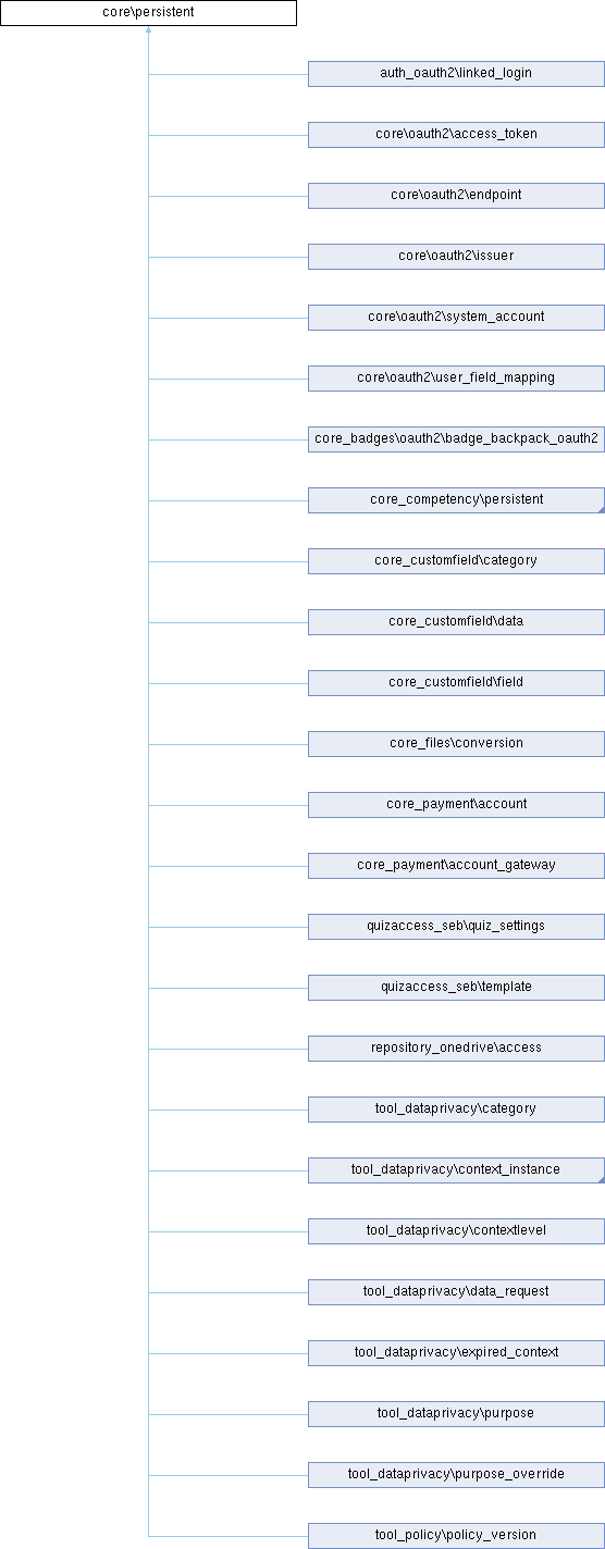 Reimplemented in tool_cohortroles\cohort_role_assignment, tool_dataprivacy\category, tool_dataprivacy\context_instance, tool_dataprivacy\contextlevel, tool_dataprivacy\data_request, tool_dataprivacy\expired_context, tool_dataprivacy\purpose, tool_dataprivacy\purpose_override, tool_policy\policy_version, auth_oauth2\linked_login, core_badges\oauth2\badge_backpack_oauth2, core_competency\competency, core_competency\competency_framework, core_competency\course_competency, core_competency\course_competency_settings, core_competency\course_module_competency, core_competency\evidence, core_competency\plan, core_competency\plan_competency, core_competency\related_competency, core_competency\template, core_competency\template_cohort, core_competency\template_competency, core_competency\user_competency, core_competency\user_competency_course, core_competency\user_competency_plan, core_competency\user_evidence, core_competency\user_evidence_competency, core_customfield\category, core_customfield\data, core_customfield\field, core_files\conversion, core\oauth2\access_token, core\oauth2\endpoint, core\oauth2\issuer, core\oauth2\system_account, core\oauth2\user_field_mapping, quizaccess_seb\quiz_settings, quizaccess_seb\template, core_payment\account, core_payment\account_gateway, and repository_onedrive\access.